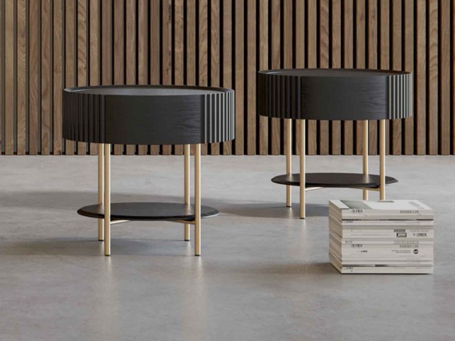 Nočné stolíky FUSANO zaujmú výrazným rebrovaným dizajnom, matným čiernym odtieňom dubu a zlatými kovovými akcentmi, ktoré im dodávajú luxusný, no zároveň moderný charakter. Vďaka kombinácii hladkých plôch a reliéfnych detailov pôsobia mimoriadne elegantne a ľahko zapadnú do moderných aj minimalistických interiérov.