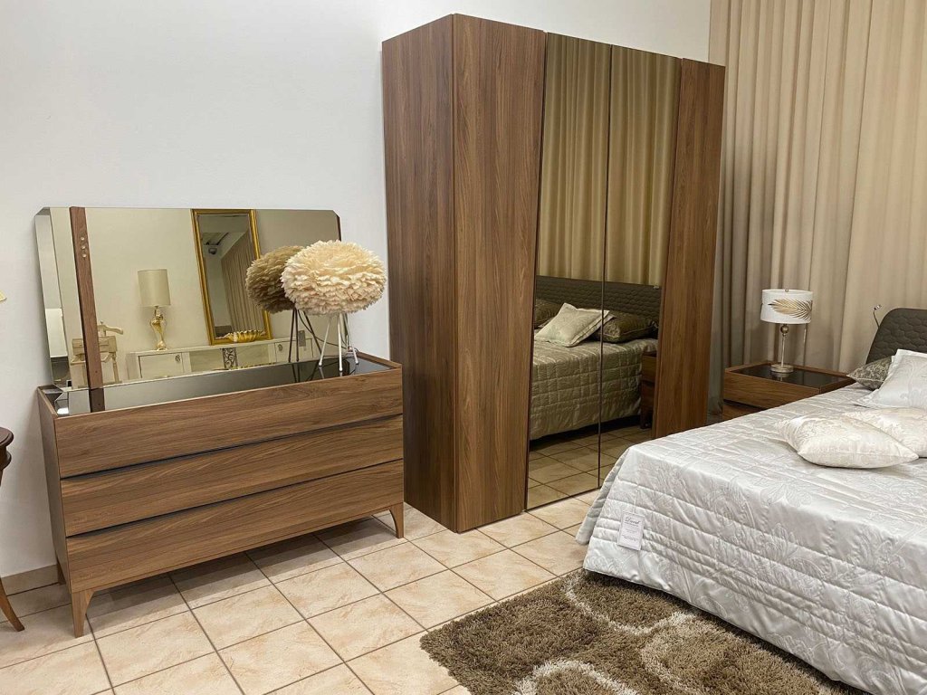 Manželská posteľ pre matrac 182x203 cm s čalúnením v eco-koži a LED osvetlením vhodným pre večerné čítanie, nočné stolíky s vrchnou doskou z kaleného skla, 3-zásuvková komoda s vrchnou doskou s kaleného skla v kombinácií s veľkým elegantným zrkadlom zrkadlom s LED osvetlením a v neposlednom rade moderná šatníková skriňa so zrkadlovými dverami, ktorá Vás ponúka dostatok úložného priestoru. Drevo-dekor v kombinácií hnedým sklom, tmavým kovom na úchytkách a zemitými farbami čalúnenia - toto všetko je ideálne dizajnové spojenie spálňového zariadenia.