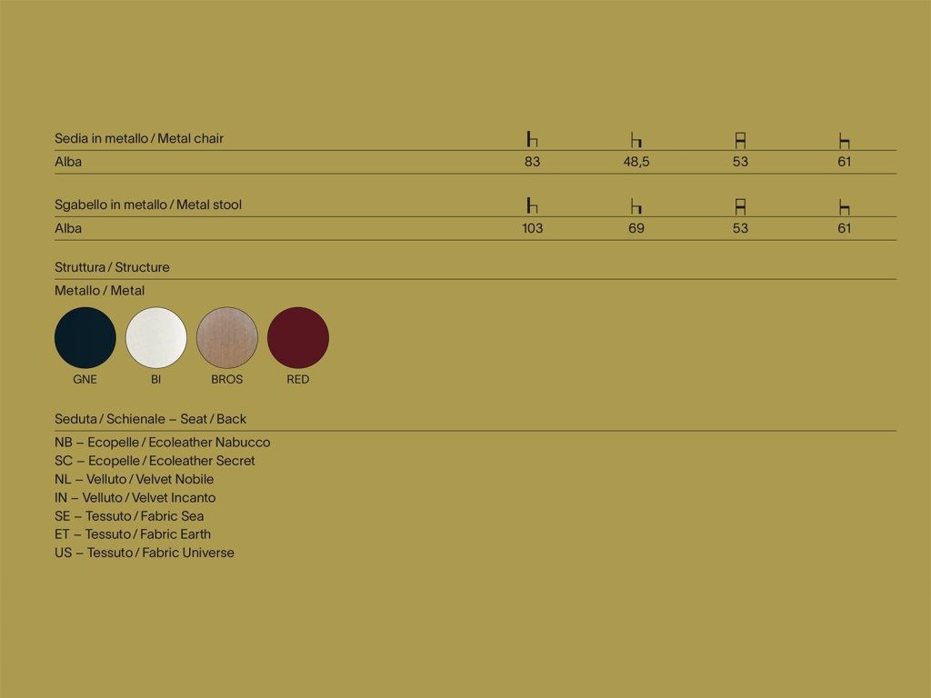 Z kolekcie ALBA sú k dispozícii dva modely stoličiek: štandardná stolička a stolička barová.