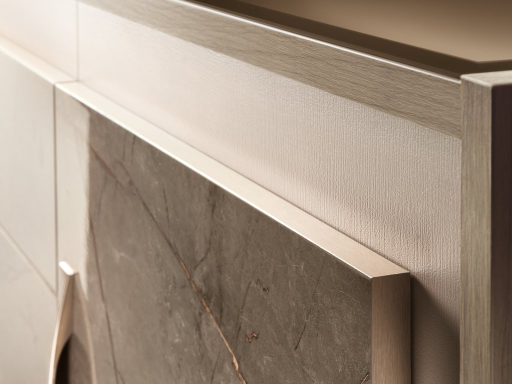 Exkluzívny moderný nábytok do jedálne AMBRA má hrany uzavreté saténovým hliníkom v bronzovej farbe.