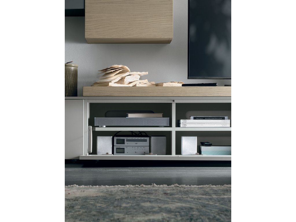 Moderná obývacia zostava je vyrobená v lakovanom matnom prevedení – GHIACCIO 173, pieskové dubové drevo a pieskový dubový laminát.