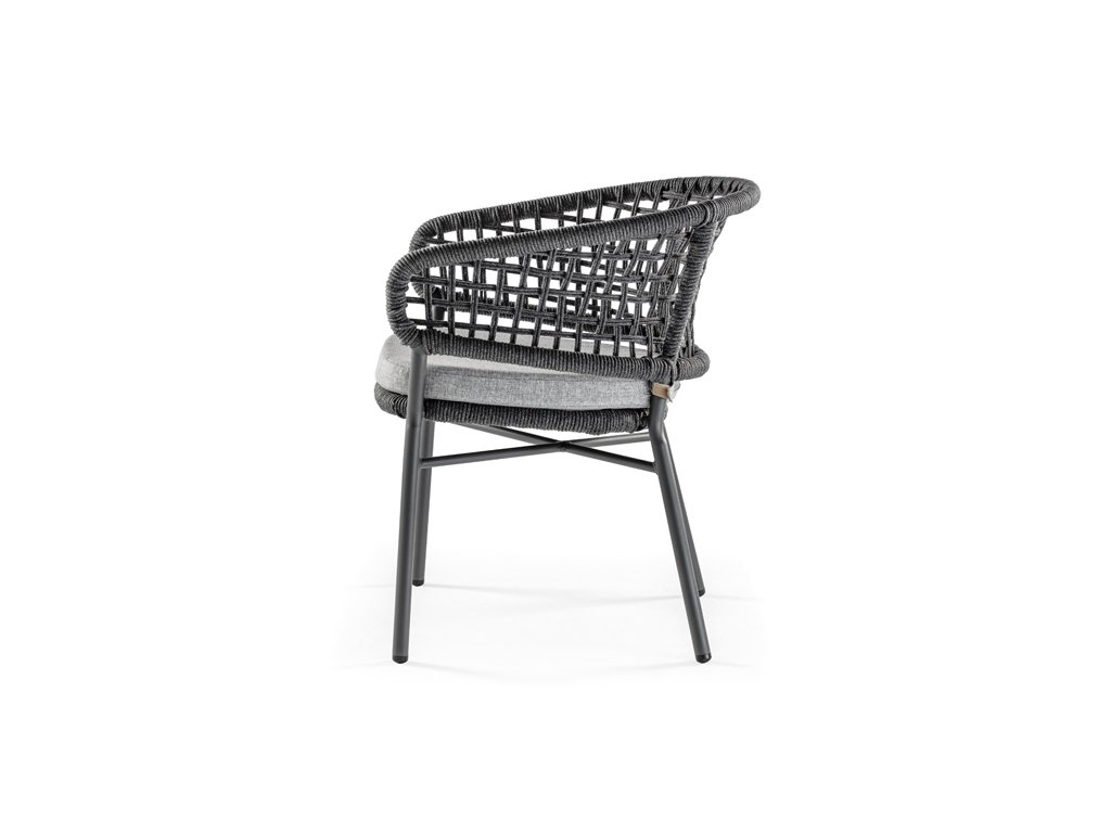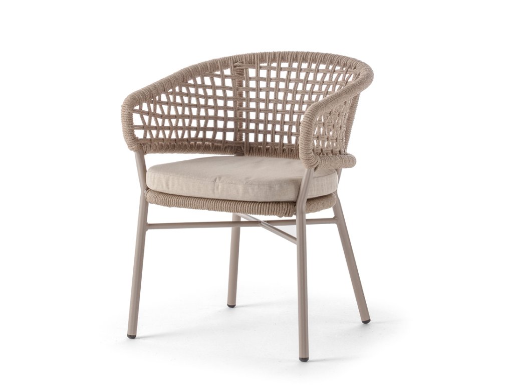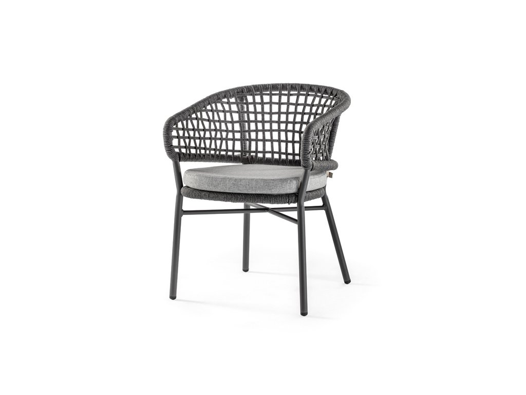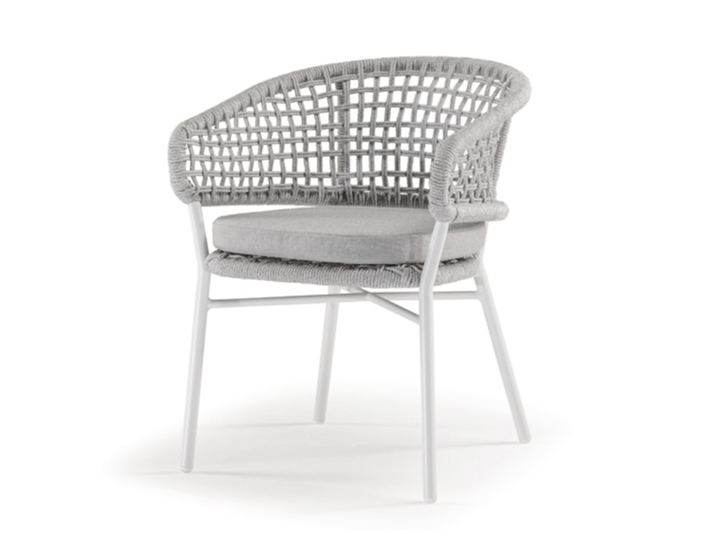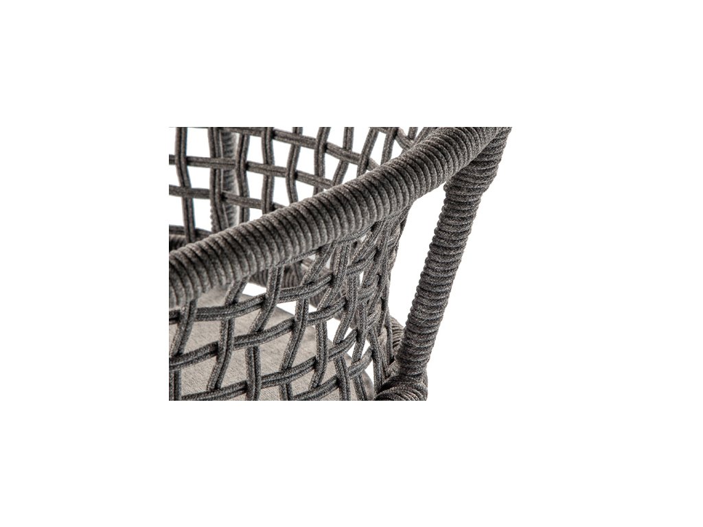 Exteriérové jedálenské kreslo ATOL má hliníkovú konštrukciu vo troch farebných variantoch, s výpletom z akrylového lana. Čalúnený vankúš má odnímateľný poťah a je vyrobený z vodoodpudivej látky olefin.