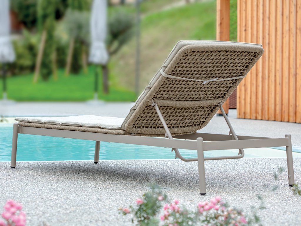 Exteriérové záhradné ležadlo ATOL má hliníkovú konštrukciu v dvoch farebných variantoch, s výpletom z akrylového lana. Čalúnený vankúš má odnímateľný poťah a je vyrobený z vodoodpudivej látky olefin.