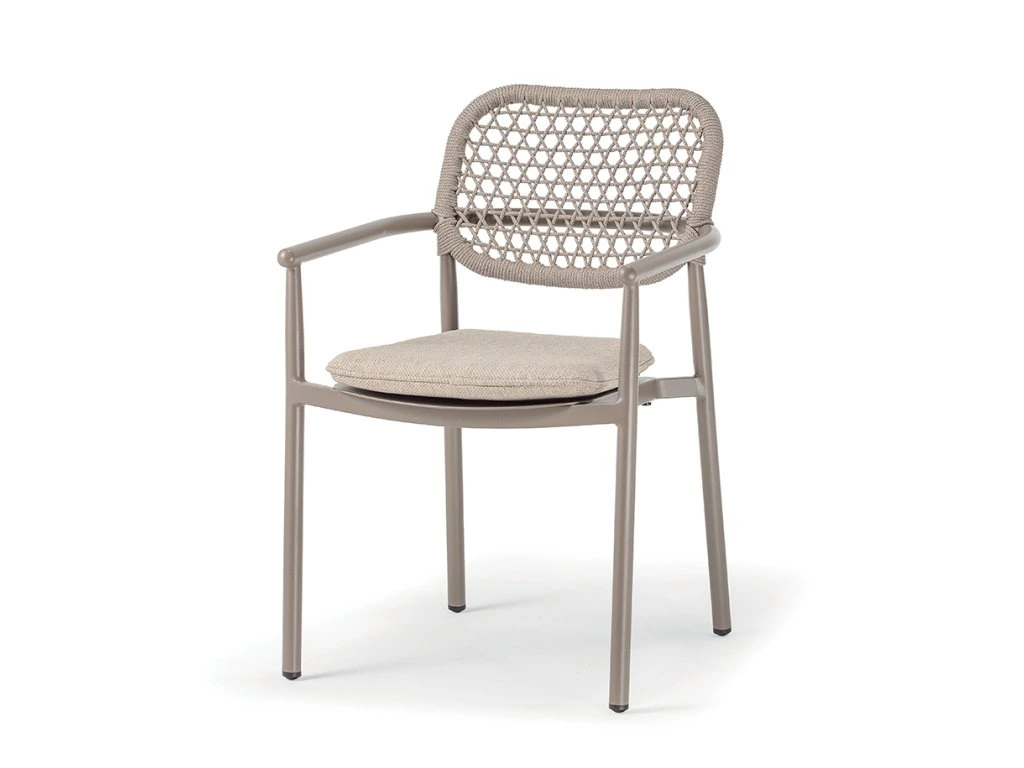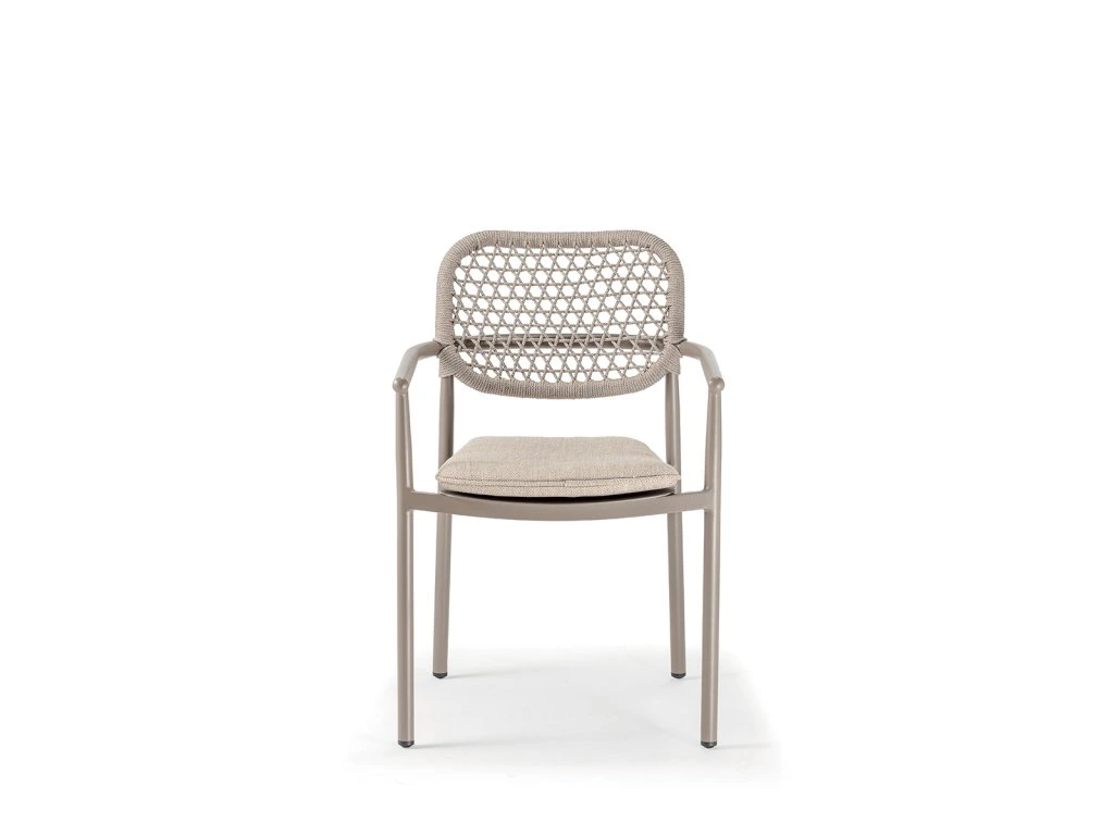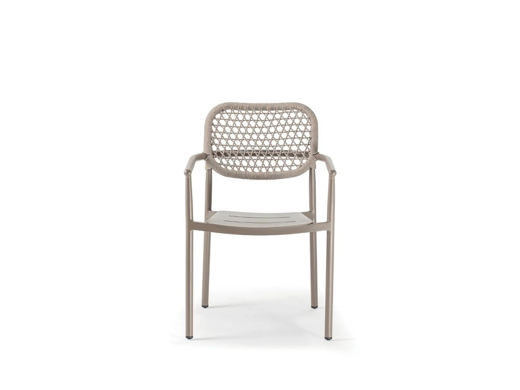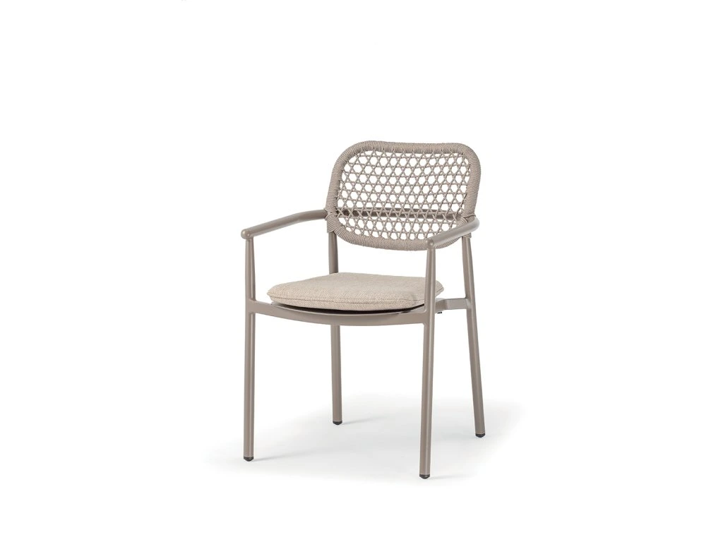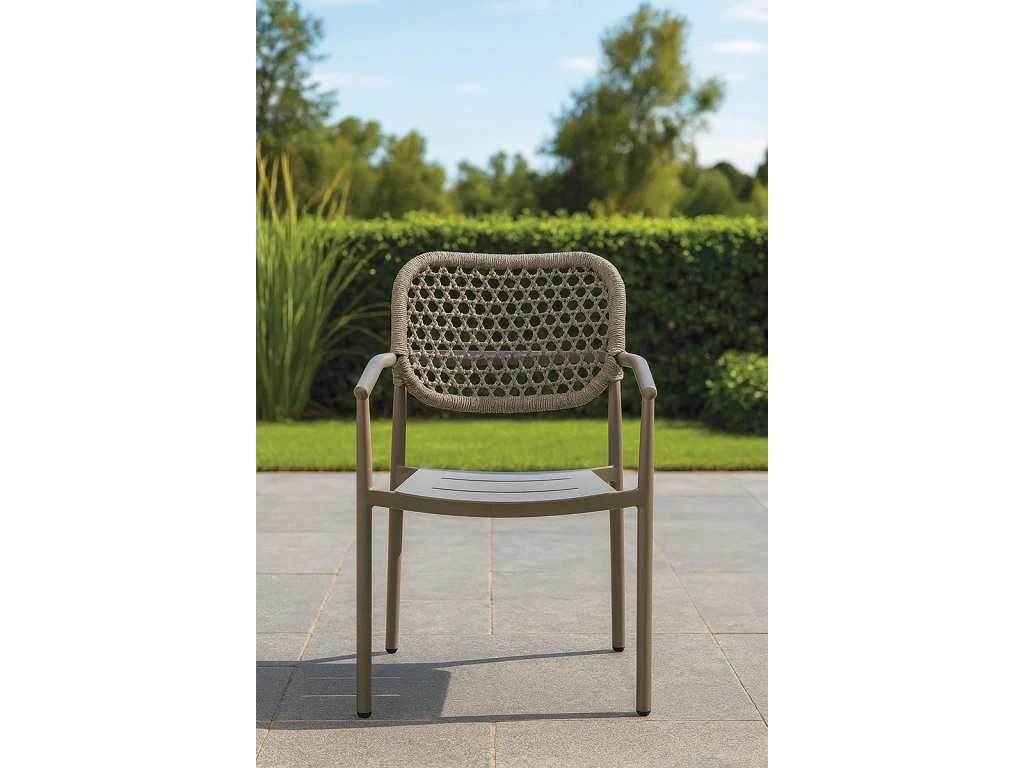 Kreslo BERLIN od spoločnosti GRATTONI predstavuje dokonalé spojenie elegancie a funkčnosti. Jeho čisté línie a jemne pletený detail z akrylového lana vytvárajú nadčasový dizajn, ktorý prirodzene zapadne do moderných aj klasických exteriérov.