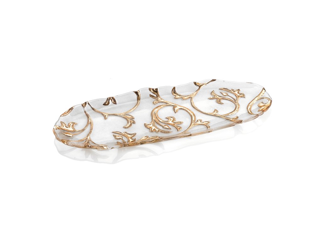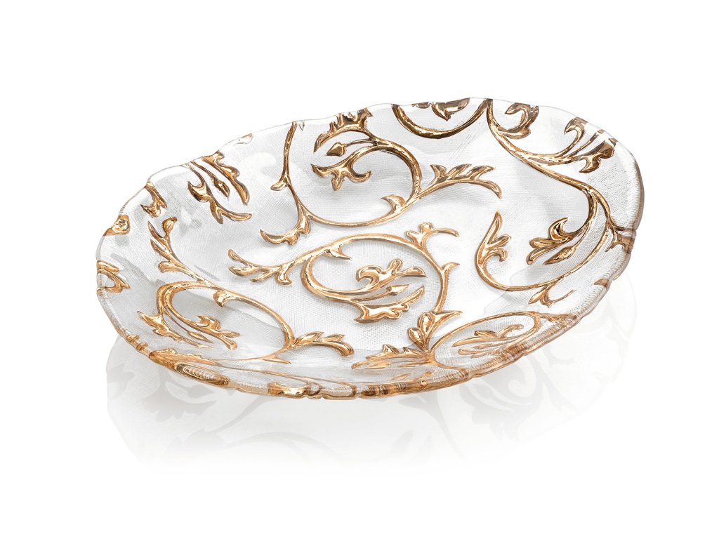 Ozdobná misa IVV BISANZIO 5549.1 je súčasťou kolekcie z číreho skla so zlatou dekoráciou.