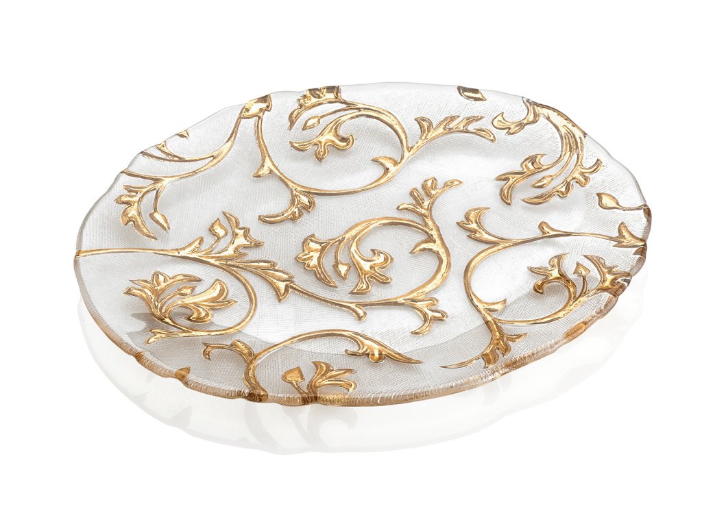 Ozdobný tanier IVV BISANZIO 5550.1 je súčasťou kolekcie z číreho skla so zlatou dekoráciou.