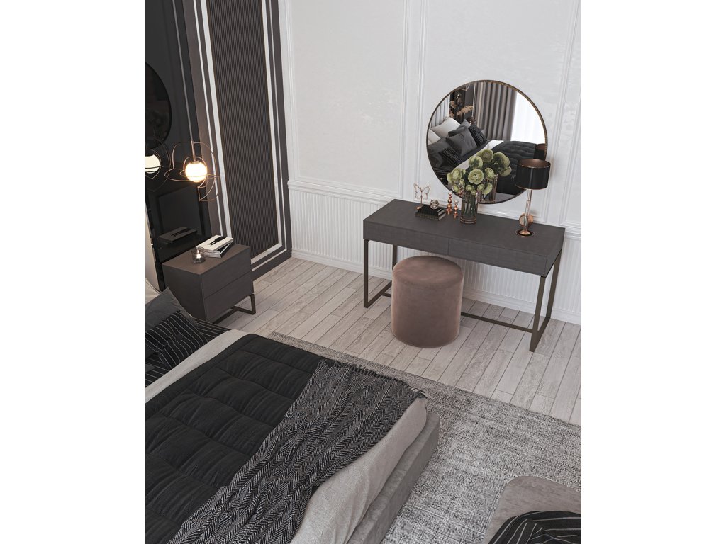 Moderná posteľ CALIPSO, ktorú charakterizuje impozantné čalúnené čelo, stelesňuje estetické a funkčné princípy nábytku do spálne. Veľkorysé rozmery postele sú v jednej harmónii s ďalšími kúskami tejto kolekcie - s nočnými stolíkmi a toaletným stolíkom/konzolou so zrkadlom. Nočný stolík CALIPSO z matného lakovaného dreva kombinuje jednu alebo dve zásuvky a má bronzovú kovovú konštrukciu.