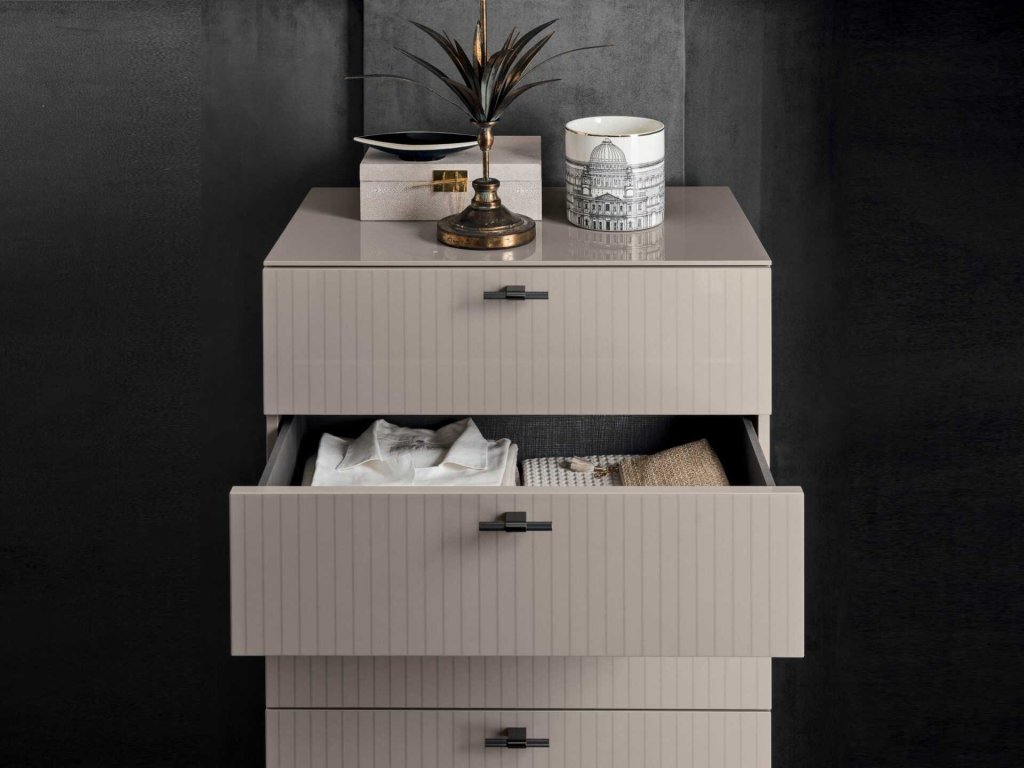 Zásuvková komoda vám poskytne dostatok úložného miesta. Nemáte dostatok miesta, nevadí! Kolekcia CLIARE má v ponuke aj úzku a vysokú komodu, ktorá dokonale sadne aj do menších priestorov. Jednou z dôležitých častí spálne je šatníková skriňa. V tomto prípade vyberáte z viacerých veľkostí šatníkovej skrine - dvoj, troj, štvor alebo šesťdverovej skrine. Na výber máme pre vás skriňu so zrkadlami alebo bez nich. Vnútorné vybavenie skrine je štandarde dodávané vrátane políc a tyčí na vešanie, ak vám toto nedostačuje, doplníme skriňu presne podľa vašich predstáv tak aby spĺňala všetky vaše požiadavky.