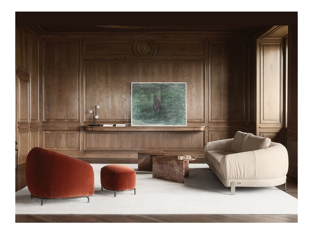- Materiál: rámová drevená konštrukcia, masívne jedľové drevo a odpruženie sedadla spevnené elastickým pásom, výplň vo forme ekologickej polyuretánovej peny, kožený alebo látkový poťah, kovové nožičky (bronz, saténová mosadz alebo starožitný bronz), chrbtové vankúše s „extra soft“ vlákna.
