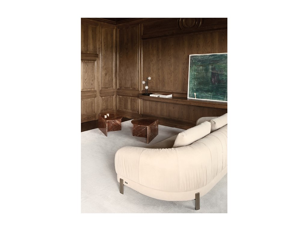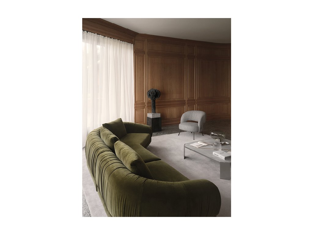 Vyznačuje sa mimoriadne rafinovaným dizajnovým čalúneným operadlom, ktoré je ručne dekorované riasením , čo z neho robí jedinečný kúsok.