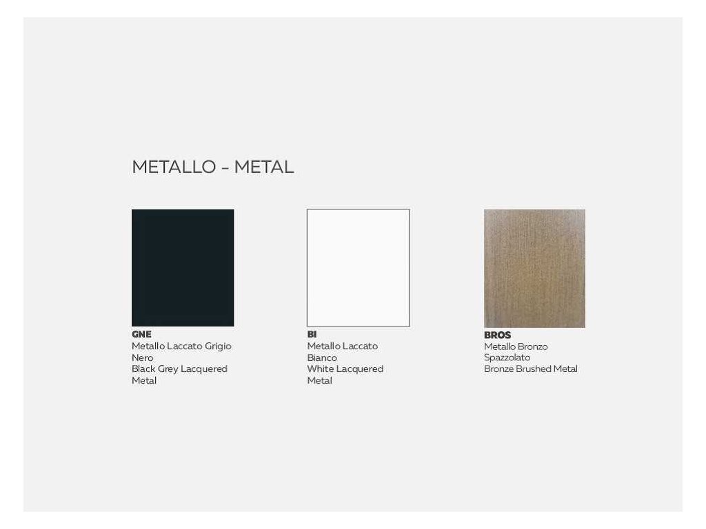 - kovová: Biela (BI), Čierna (GNE), kartáčovaná bronz (BROS).