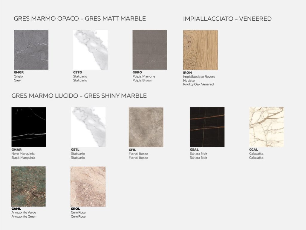 - Lesklá mramorová kamenina (GMAR, GSTL, GSAL, GCAL, GFIL, GROL, GAML).