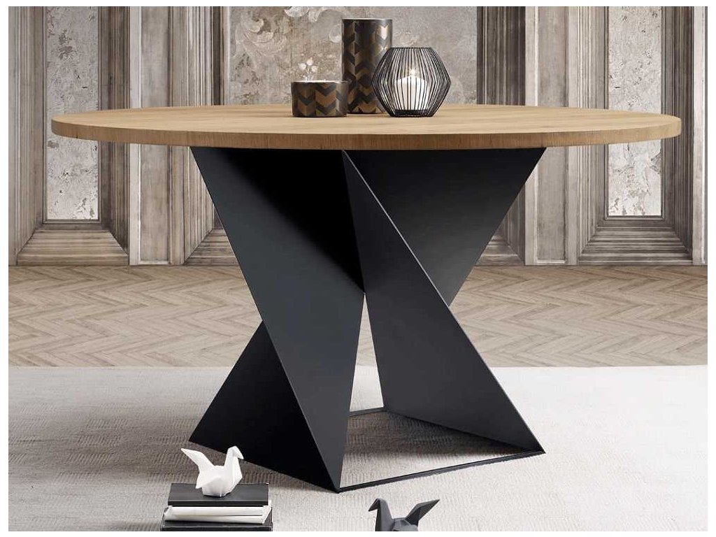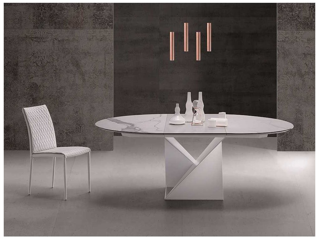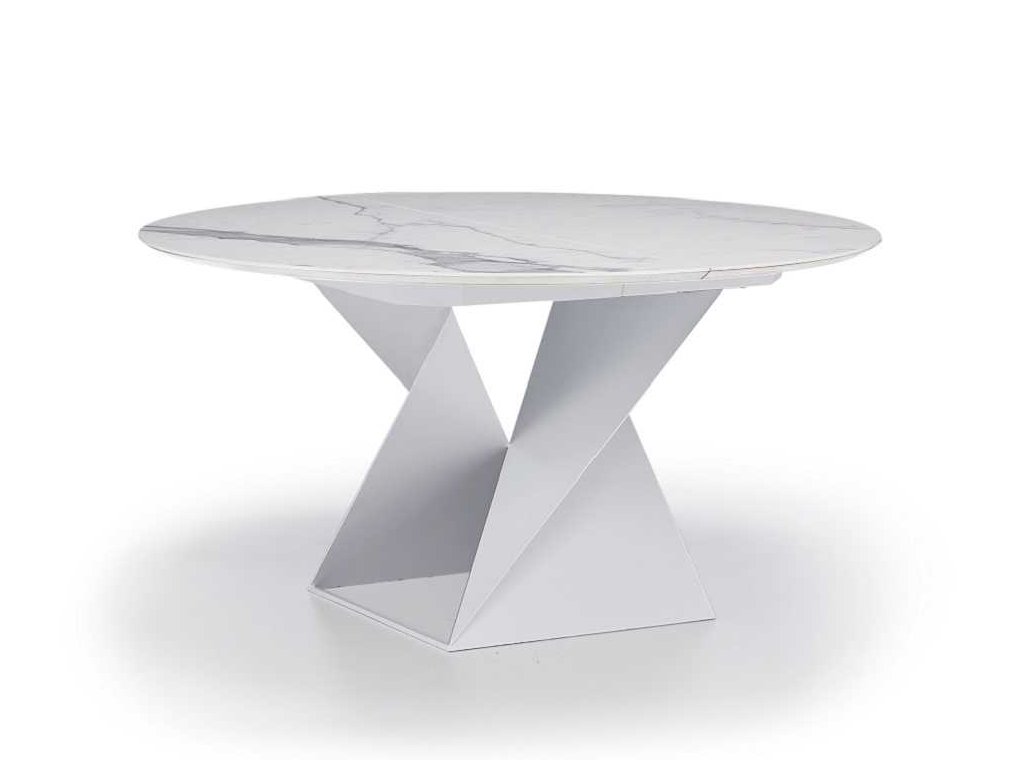 Okrúhly jedálenský stôl CUBE s rozťahovaním, v sebe kombinuje originálnu a modernú podnož, vyhotovenú z kvalitného kovu v troch farbách a hornú dosku v drevenej dyhe alebo v matnom či lesklom kameninovom prevedení.