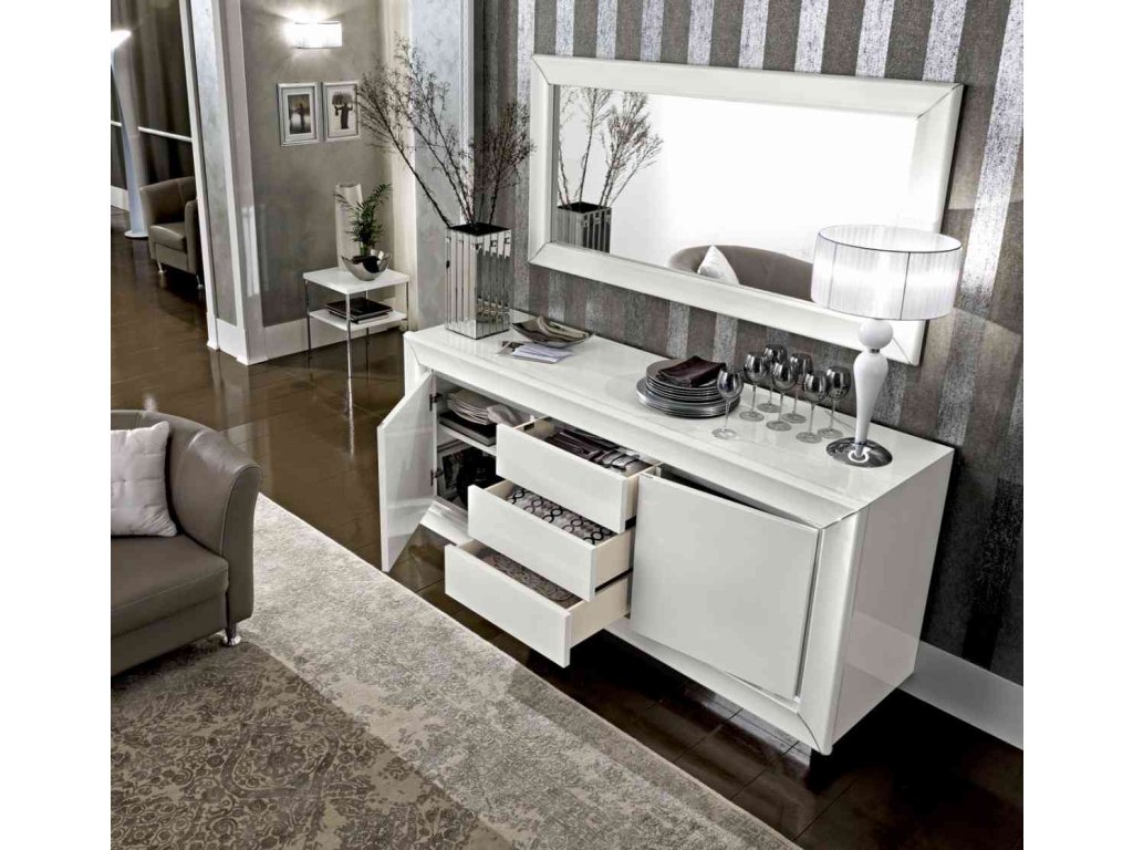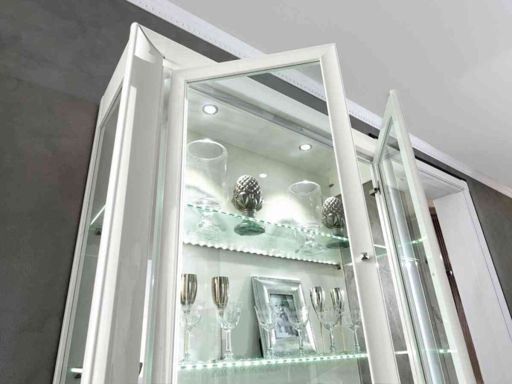 Vitríny a komody/príborníky z kolekcie DAMA BIANCA sú v ponuke vo viacerých rozmeroch a sú dodávané s LED osvetlením.