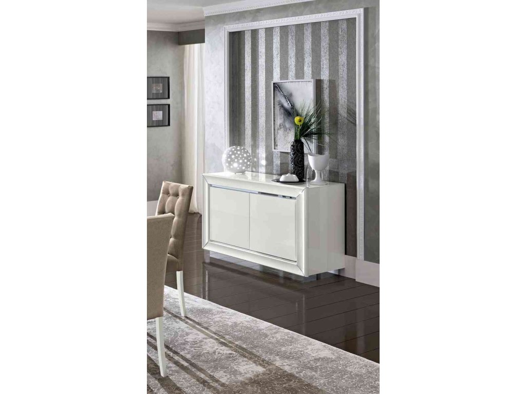 Pevný jedálenský stôl na stredovej nohe je vo farbe bielej vo vysokom lesku s prvkami v chrómovom vzhľade.
