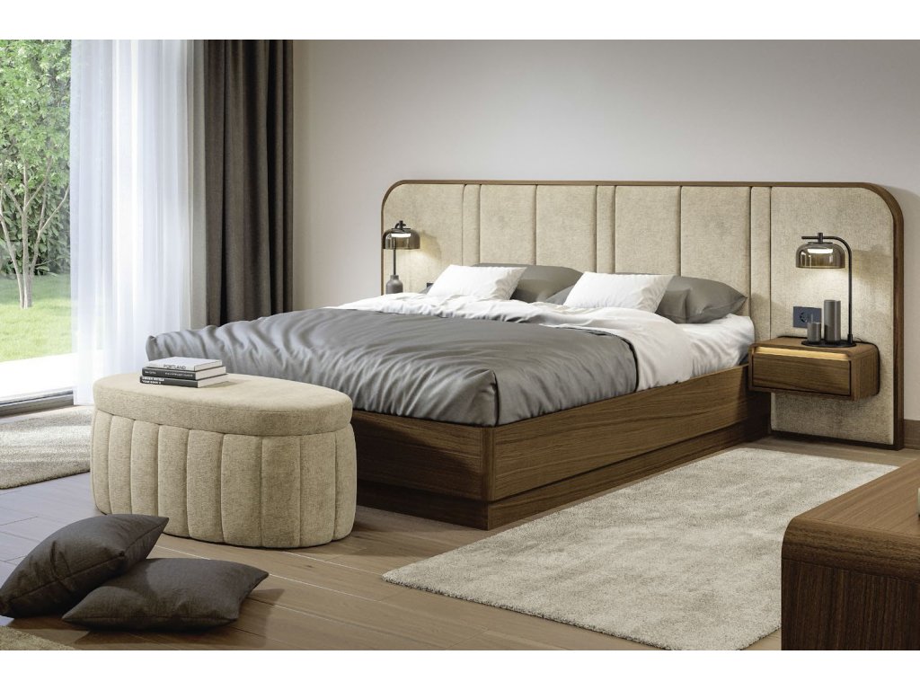 - Posteľ s čalúneným čelom (rôzne verzie: drevený alebo čalúnený rám postele so soklom alebo so skrytými nožičkami):