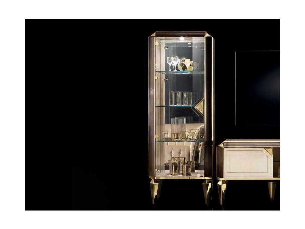 Zaujímavý taliansky dizajn pre Váš interiér. Nábytok z kolekcie DIAMANTE čerpá inšpiráciu z geometrických tvarov z brúsených diamantov, ktoré zvýrazňujú nádherné línie predstavujúce to najlepšie z "MADE IN ITALY". Každý detail v kolekcii DIAMANTE odzrkadľuje vycibrený vkus, ktorý je súčasťou jemnej práce klenotníka, pričom detaily každého kusu nábytku sú vypracované tak, aby pôsobili moderným dojmom, vďaka čomu elegantne vyniknú v akomkoľvek prestížnom interiéri. Skvostnú kolekciu DIAMANTE treba obdivovať ako šperk. Základný koncept kolekcie DIAMANTE je fascinujúci zložitý povrch vzácneho diamantu. Kolekcia DIAMANTE je navrhnutá z vysoko-technického materiálu TECRES. Materiál TECRES vzniká vytlačením polyméru, ktorý sa následne lisuje pri vysokom tlaku. Výsledné kusy sú extrémne tvrdé a robustné. Nábytok z kolekcie DIAMANTE je vyrábaný v mramorovom dekore vo vysokom lesku so zlatými detailmi v kombinácií s tmavo-hnedým drevom vo vysokom lesku. Vitríny z kolekcie DIAMANTE sú dodávané s LED osvetlením, sklenenými policami a zadná stena vitrín je so zrkadlom. Luxusne vynikne tak všetko, čo do vitrín umiestnite. Dovoľte si vo Vašom interiéri luxusné nadštandardné kúsky a zariaďte každú miestnosť vo Vašom dome touto elegantnou kolekciou. Vitríny môžete doplniť komodou alebo televíznou skrinkou, tieto Vám doprajú množstvo úložného priestoru. Konzola z kolekcie je dizajnovo riešená ako do predsiene tak aj do jedálne alebo obývačky. Je nádherná v kombinácií s luxusným zrkadlom. V jedálni je potrebný jedálenský stôl. Táto kolekcia ponúka štvorcový, okrúhly a obdĺžnikový jedálenský stôl s rozťahovaním alebo bez rozťahovania. K jedálenskému stolu môžete doplniť luxusné stoličky, ktoré si môžete objednať aj v iných poťahových látkach ako sú na obrázkoch.