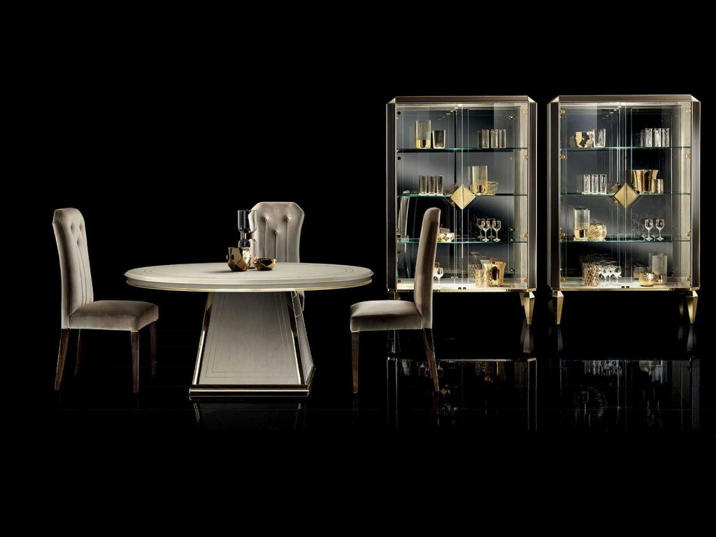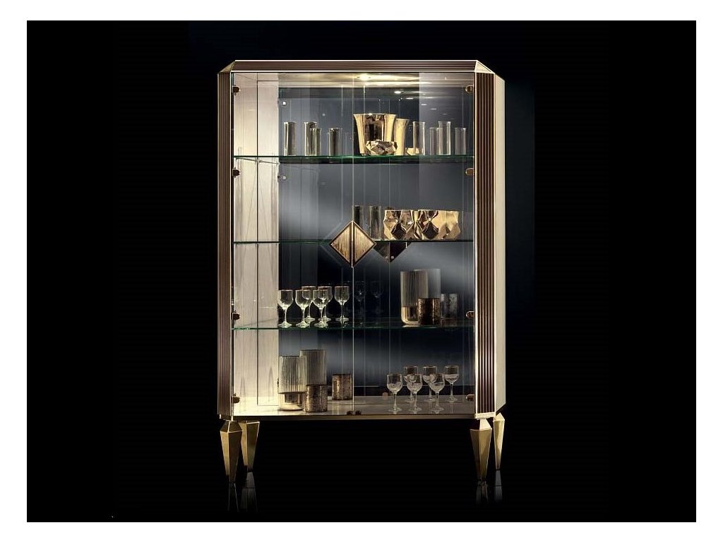 Zaujímavý taliansky dizajn pre Váš interiér. Nábytok z kolekcie DIAMANTE čerpá inšpiráciu z geometrických tvarov z brúsených diamantov, ktoré zvýrazňujú nádherné línie predstavujúce to najlepšie z "MADE IN ITALY". Každý detail v kolekcii DIAMANTE odzrkadľuje vycibrený vkus, ktorý je súčasťou jemnej práce klenotníka, pričom detaily každého kusu nábytku sú vypracované tak, aby pôsobili moderným dojmom, vďaka čomu elegantne vyniknú v akomkoľvek prestížnom interiéri. Skvostnú kolekciu DIAMANTE treba obdivovať ako šperk. Základný koncept kolekcie DIAMANTE je fascinujúci zložitý povrch vzácneho diamantu. Kolekcia DIAMANTE je navrhnutá z vysoko-technického materiálu TECRES. Materiál TECRES vzniká vytlačením polyméru, ktorý sa následne lisuje pri vysokom tlaku. Výsledné kusy sú extrémne tvrdé a robustné. Nábytok z kolekcie DIAMANTE je vyrábaný v mramorovom dekore vo vysokom lesku so zlatými detailmi v kombinácií s tmavo-hnedým drevom vo vysokom lesku. Vitríny z kolekcie DIAMANTE sú dodávané s LED osvetlením, sklenenými policami a zadná stena vitrín je so zrkadlom. Luxusne vynikne tak všetko, čo do vitrín umiestnite. Dovoľte si vo Vašom interiéri luxusné nadštandardné kúsky a zariaďte každú miestnosť vo Vašom dome touto elegantnou kolekciou. Vitríny môžete doplniť komodou alebo televíznou skrinkou, tieto Vám doprajú množstvo úložného priestoru. Konzola z kolekcie je dizajnovo riešená ako do predsiene tak aj do jedálne alebo obývačky. Je nádherná v kombinácií s luxusným zrkadlom. V jedálni je potrebný jedálenský stôl. Táto kolekcia ponúka štvorcový, okrúhly a obdĺžnikový jedálenský stôl s rozťahovaním alebo bez rozťahovania. K jedálenskému stolu môžete doplniť luxusné stoličky, ktoré si môžete objednať aj v iných poťahových látkach ako sú na obrázkoch.