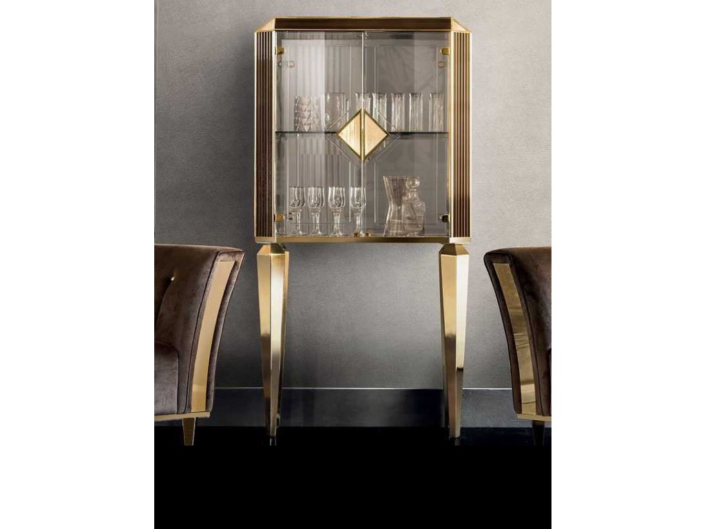 Zaujímavý taliansky dizajn pre Váš interiér. Nábytok z kolekcie DIAMANTE čerpá inšpiráciu z geometrických tvarov z brúsených diamantov, ktoré zvýrazňujú nádherné línie predstavujúce to najlepšie z "MADE IN ITALY". Každý detail v kolekcii DIAMANTE odzrkadľuje vycibrený vkus, ktorý je súčasťou jemnej práce klenotníka, pričom detaily každého kusu nábytku sú vypracované tak, aby pôsobili moderným dojmom, vďaka čomu elegantne vyniknú v akomkoľvek prestížnom interiéri. Skvostnú kolekciu DIAMANTE treba obdivovať ako šperk. Základný koncept kolekcie DIAMANTE je fascinujúci zložitý povrch vzácneho diamantu. Kolekcia DIAMANTE je navrhnutá z vysoko-technického materiálu TECRES. Materiál TECRES vzniká vytlačením polyméru, ktorý sa následne lisuje pri vysokom tlaku. Výsledné kusy sú extrémne tvrdé a robustné. Nábytok z kolekcie DIAMANTE je vyrábaný v mramorovom dekore vo vysokom lesku so zlatými detailmi v kombinácií s tmavo-hnedým drevom vo vysokom lesku. Vitríny z kolekcie DIAMANTE sú dodávané s LED osvetlením, sklenenými policami a zadná stena vitrín je so zrkadlom. Luxusne vynikne tak všetko, čo do vitrín umiestnite. Dovoľte si vo Vašom interiéri luxusné nadštandardné kúsky a zariaďte každú miestnosť vo Vašom dome touto elegantnou kolekciou. Vitríny môžete doplniť komodou alebo televíznou skrinkou, tieto Vám doprajú množstvo úložného priestoru. Konzola z kolekcie je dizajnovo riešená ako do predsiene tak aj do jedálne alebo obývačky. Je nádherná v kombinácií s luxusným zrkadlom. V jedálni je potrebný jedálenský stôl. Táto kolekcia ponúka štvorcový, okrúhly a obdĺžnikový jedálenský stôl s rozťahovaním alebo bez rozťahovania. K jedálenskému stolu môžete doplniť luxusné stoličky, ktoré si môžete objednať aj v iných poťahových látkach ako sú na obrázkoch.