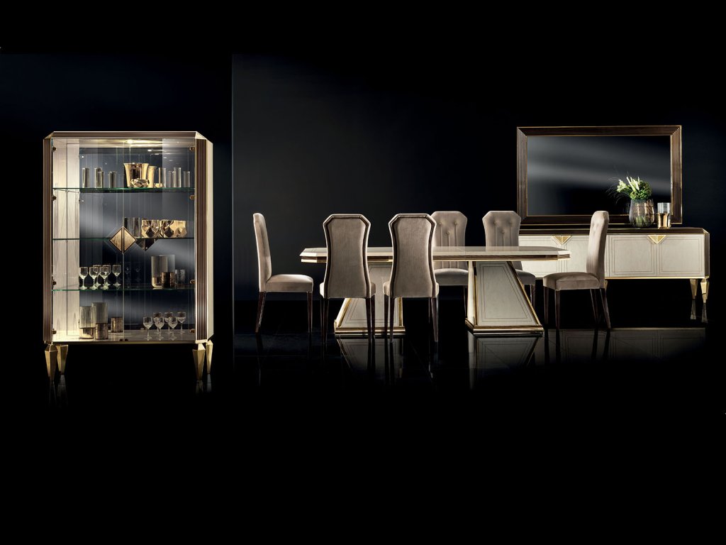Exkluzívny nábytok ideálny pre nadštandardné zariadenie interiéru jedálne, obývacej časti, predsiene ale i spálne. Skvostná jedáleň DIAMANTE je vyrábaná vo vysokom lesku so zlatým dekorovaním a tmavohnedým drevom.