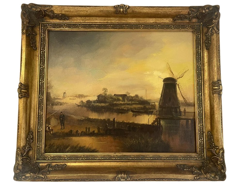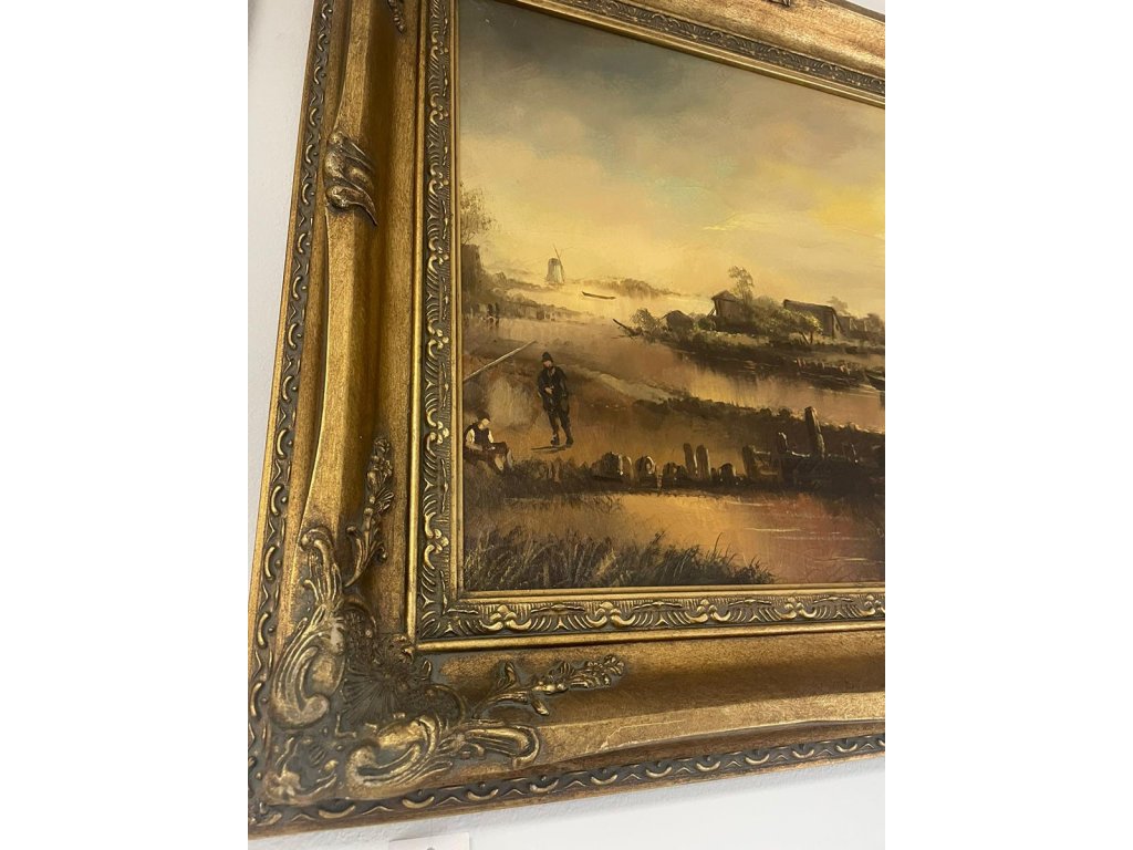 Táto pôsobivá olejomaľba zachytáva pokojnú krajinu s veterným mlynom pri západe slnka, vytvárajúc nostalgickú atmosféru pokojného vidieka. Zátišie s rybárom, loďkami a rozostupujúcim sa večerným svetlom ponúka pohľad do tichého sveta, kde čas plynie pomaly a pokojne.