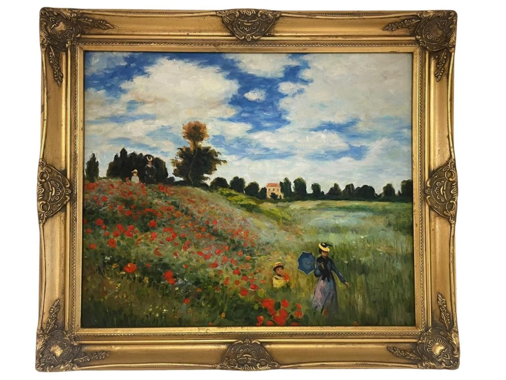 Táto pôsobivá olejomaľba inšpirovaná impresionizmom zachytáva pokojnú scénu letnej prechádzky v prírode. Ženy s dáždnikom a dieťa, ktoré kráčajú cez lúku posiatu červenými makmi, pôsobia ľahko a vzdušne – akoby ich unášala letná vôňa a jemný vánok.