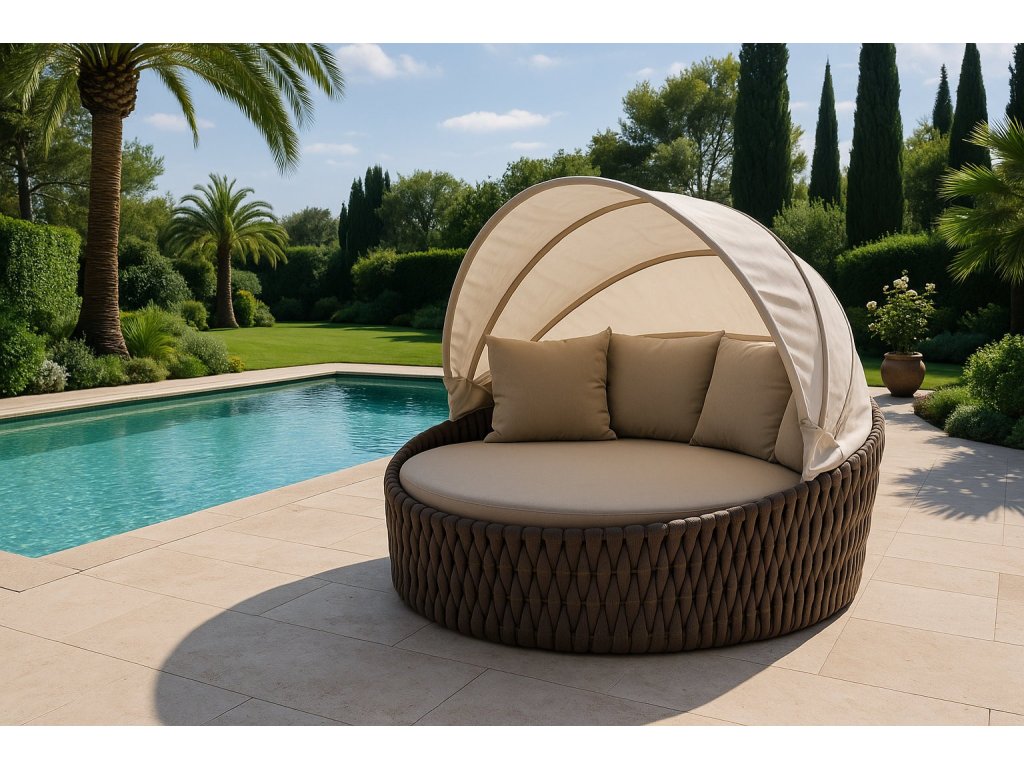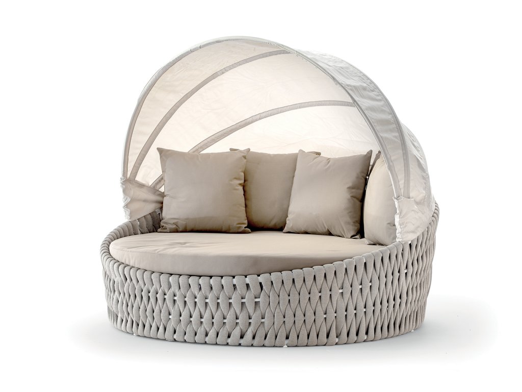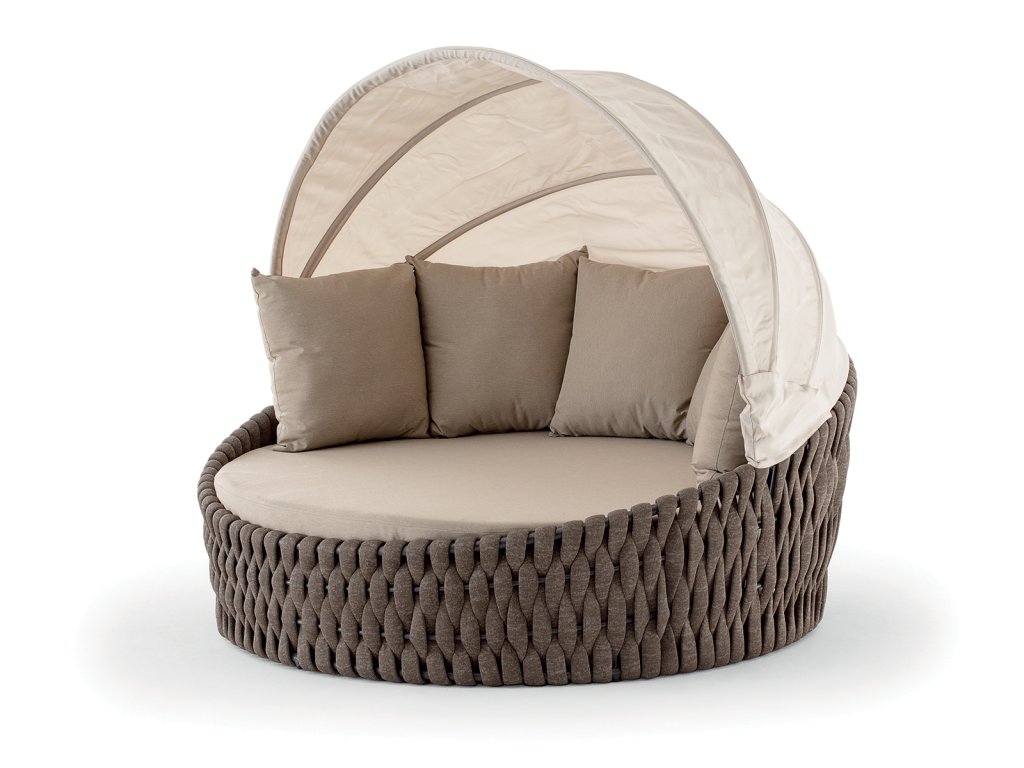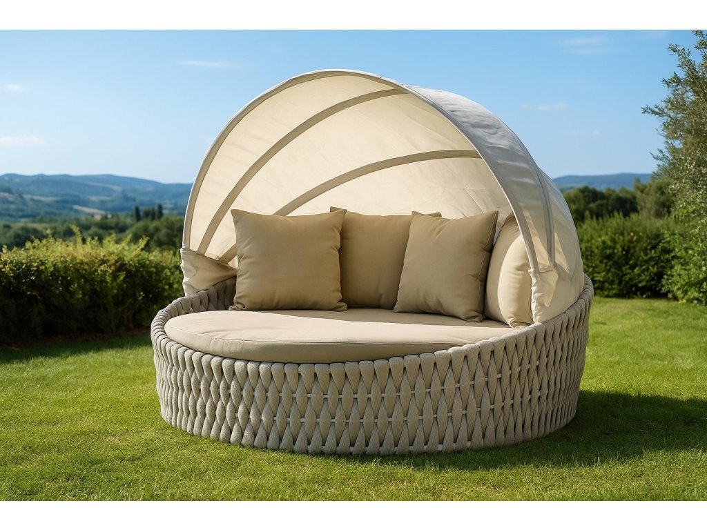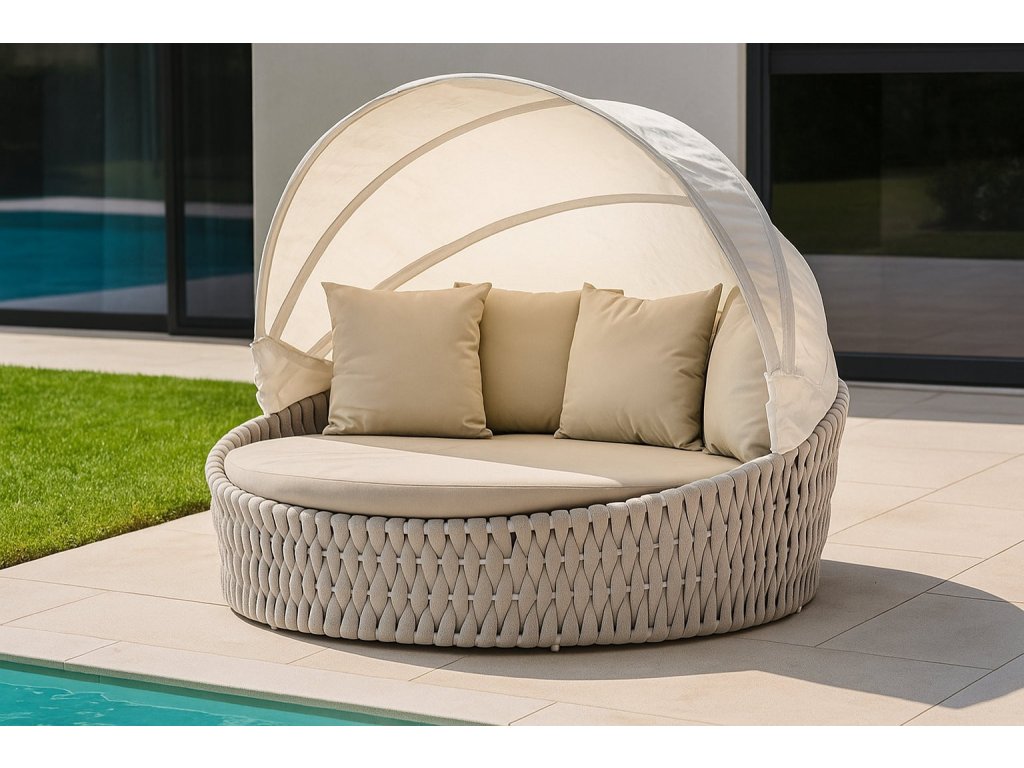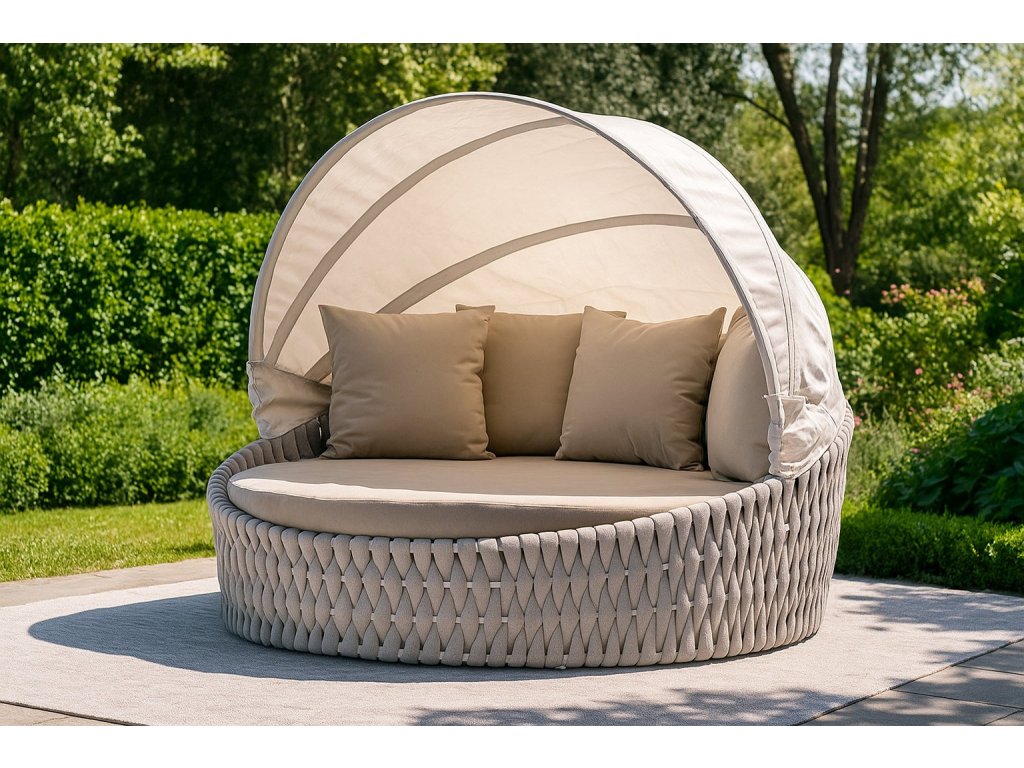 - Plážová posteľ má kruhový tvar. Konštrukcia je dizajnovo prepletaná špeciálnym textilným materiálom.