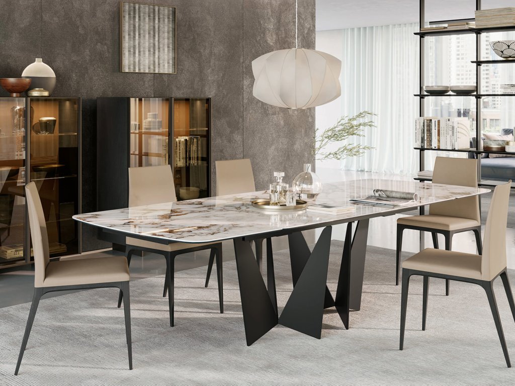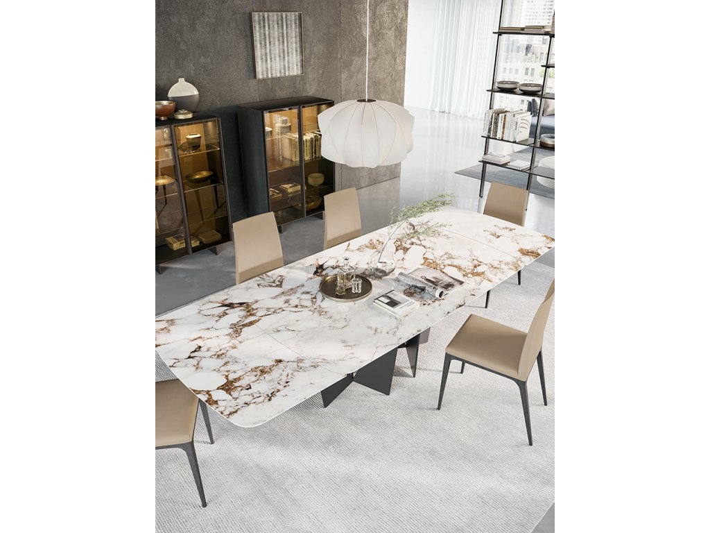 Tento stôl je dostupný v pevnom variante alebo vo variante s rozťahovaním a ponúka rôzne možnosti povrchového prevedenia, čím je možné prispôsobiť ho individuálnym preferenciám a štýlu zariadenia. Horná doska je k dispozícii buď v prevedeniu dreva s hrúbkou 40 mm, v lakovanom skle s hrúbkou 12 mm, alebo v gresu spojeného so sklom s hrúbkou 14 mm, čo zabezpečuje stabilitu a zároveň módny vzhľad.
