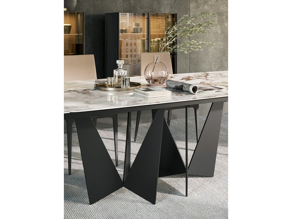 Dizajnová podnož jedálenského stola EIFFEL je navrhnutá tak, aby vytvárala dojem vzdušnosti a elegancie. Skrížené tenké kovové čepele ponúkajú stabilitu, pričom ich umiestnenie umožňuje bezproblémové sedenie bez nežiaducich prekážok.