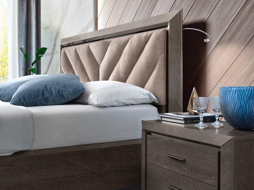 - Posteľ boiserie – čalúnené čelo + čalúnený rám postele: