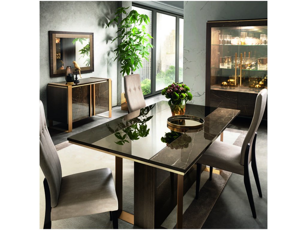 Koncept kolekcie je inšpirovaný klasickým/súčasným dualizmom, kontrastnými textúrami dvoch povrchových úprav - tmavých odtieňov wenge a lesklým mramorovým dekorom, ktoré korunujú elegantné zlaté prvky. Tieto prvky s matným zlatým povrchom sú efektne použité na komodách, vitrínach, jedálenských stoloch, televíznych skrinkách, konzole a konferenčných stolíkoch. Veď posúďte sami!