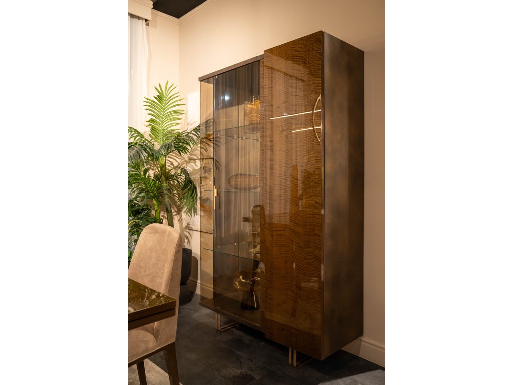 Sklenená rohová časť, ktorá je súčasťou bufetov, príborníkov či vitrín, nielenže pridáva priestoru na hĺbke a svetle, ale aj zdôrazňuje kvalitu a precíznosť spracovania.