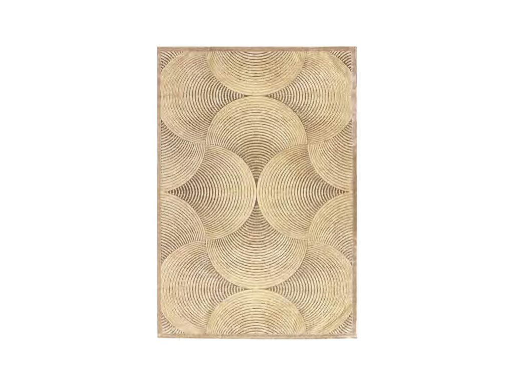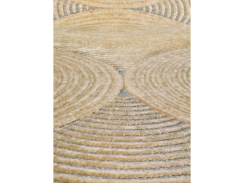 Jeho abstraktný vzor s okrúhlymi líniami je zameraný na moderný dizajn v rôznych odtieňoch béžovej a šedo-hnedej. Trojrozmernosť tejto geometrickej hry ešte viac umocňuje kontrast medzi spodnou ženilkovou časťou a vyššou viskózovou časťou.