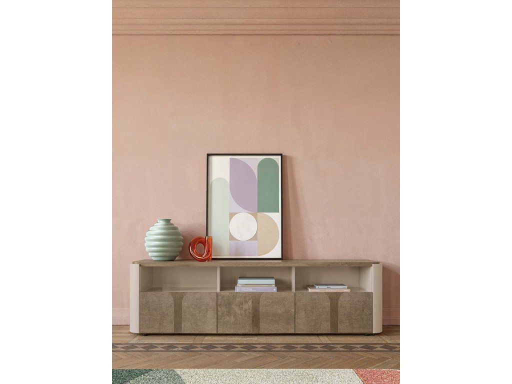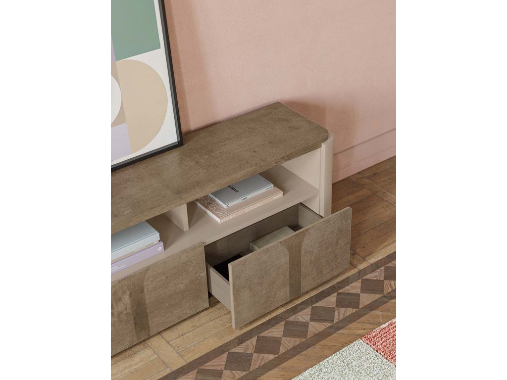 Každý kus je precízne vyrobený v teplých hnedých odtieňoch, doplneného jemnými geometrickými detailmi, ktoré zdobia čelné panely a stolové dosky. Povrchová úprava Matte Mild Umber na bokoch dodáva kontrast a zvýrazňuje hĺbku a štruktúru dizajnu.