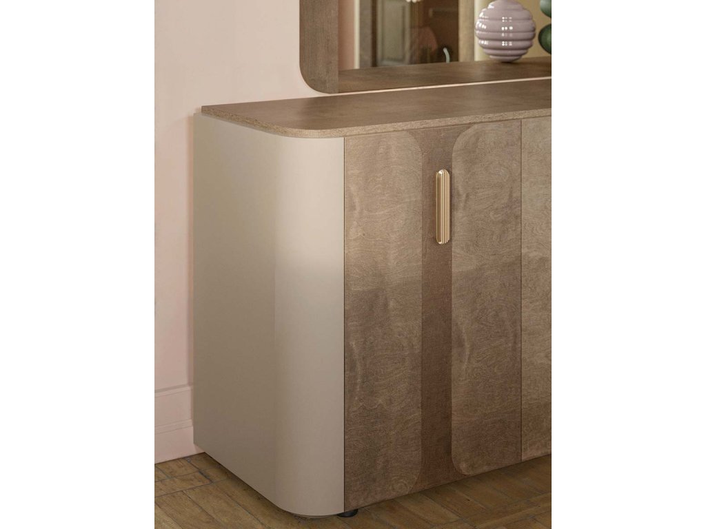 Každý kus je precízne vyrobený v teplých hnedých odtieňoch, doplneného jemnými geometrickými detailmi, ktoré zdobia čelné panely a stolové dosky. Povrchová úprava Matte Mild Umber na bokoch dodáva kontrast a zvýrazňuje hĺbku a štruktúru dizajnu.