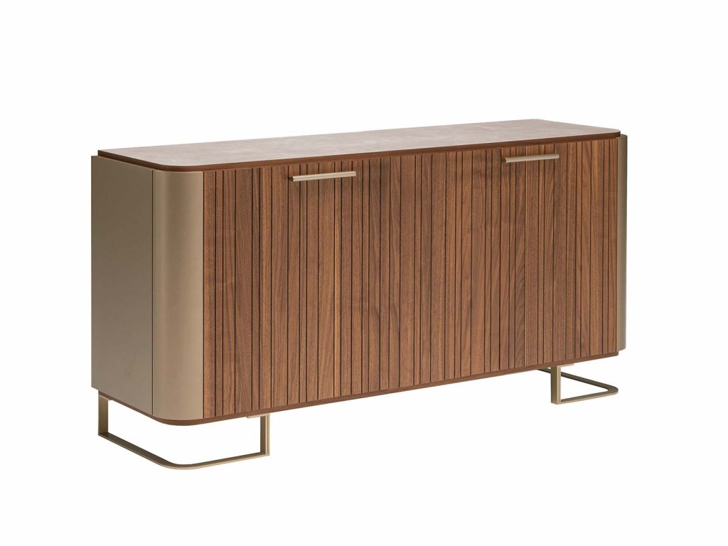 - Farebné prevedenie: CHANNEL WALNUT VENEER – drážkovaná orechová dyha, ECO STONE BOTTICINO – dekor kameniny botticino, GOLD LACQUER – zlatý lak.