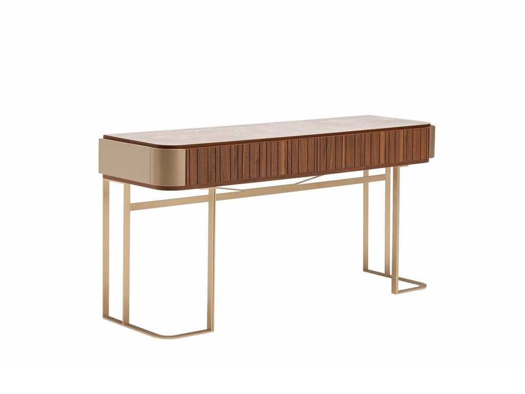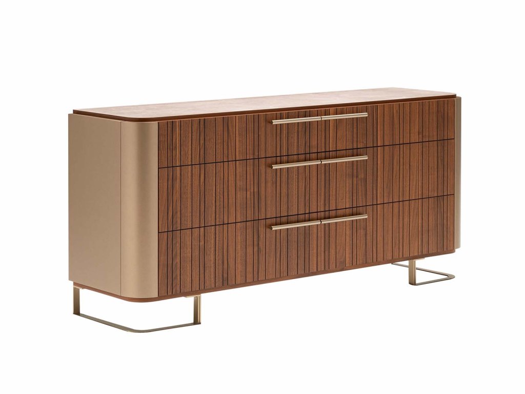 - Farebné prevedenie: CHANNEL WALNUT VENEER – drážkovaná orechová dyha, ECO STONE BOTTICINO – dekor kameniny botticino, GOLD LACQUER – zlatý lak.