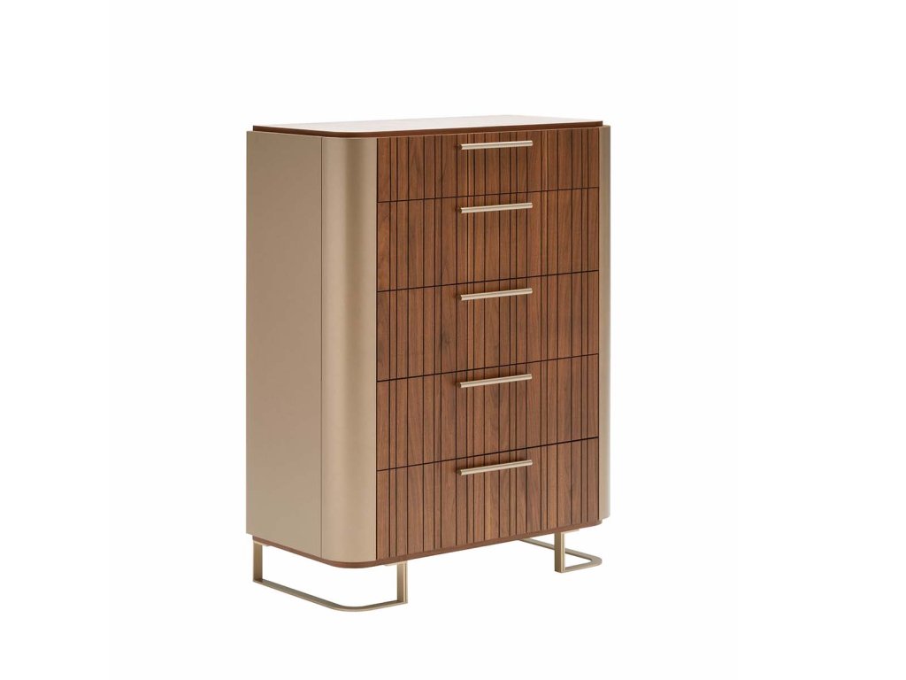 - Farebné prevedenie: CHANNEL WALNUT VENEER – drážkovaná orechová dyha, ECO STONE BOTTICINO – dekor kameniny botticino, GOLD LACQUER – zlatý lak.