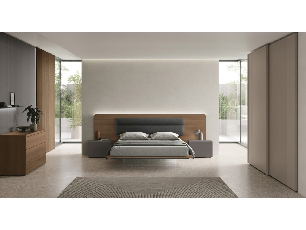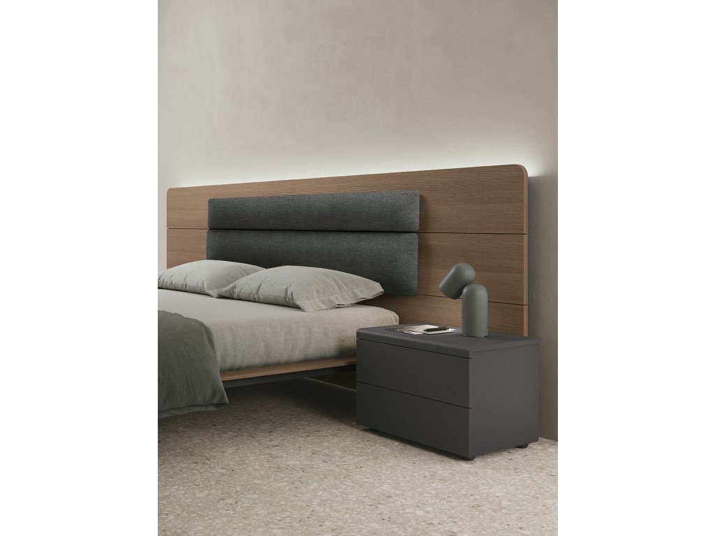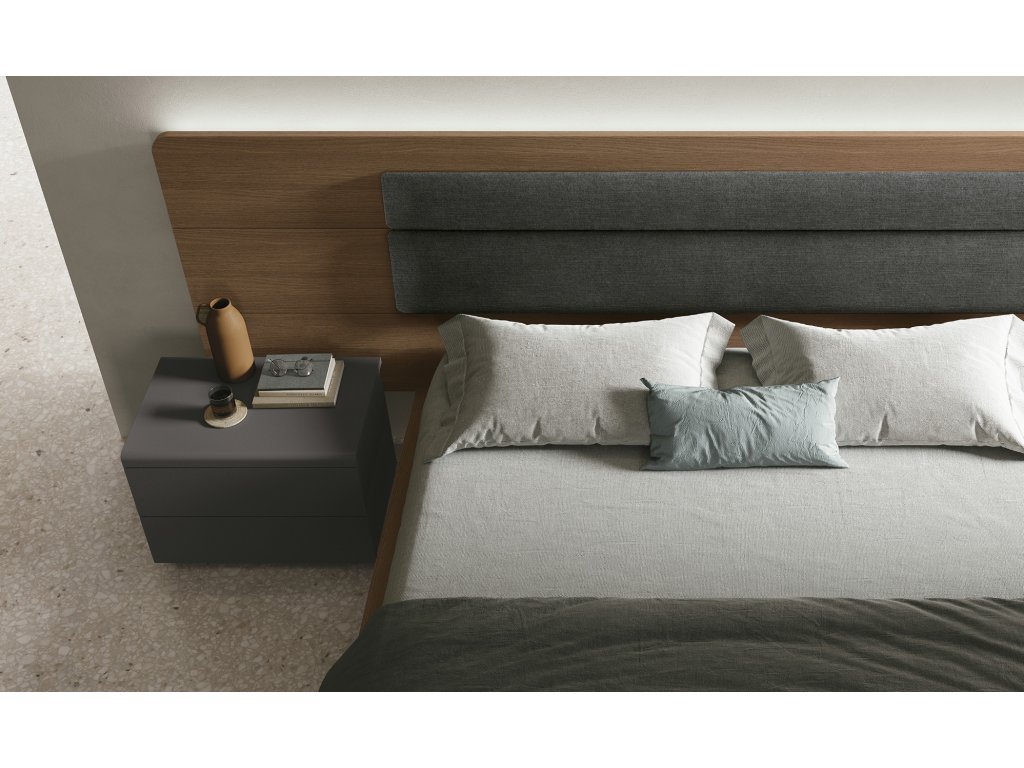- Leonardo – posteľ s predĺženým čelom v dekore dub cognac a textilným čalúnením Giulia.