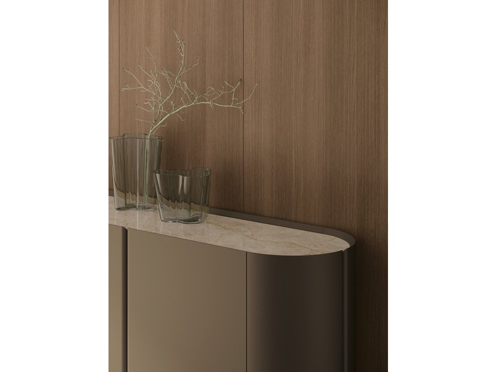 - Calipso – komoda so zaoblenými líniami, kovovo-šedý lakovaný povrch, vrchná doska gres Taj Mahal.
