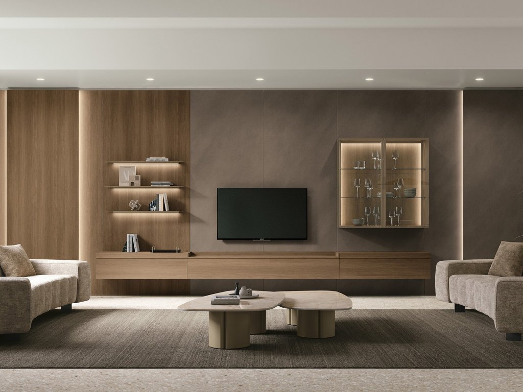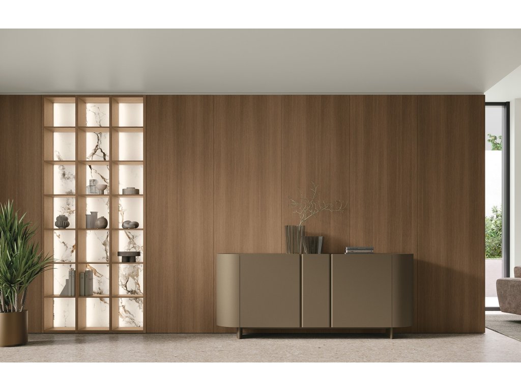 - Glove Unit GL101/GL102 – systém panelov a úložných prvkov v dekore rovere cognac a calce scura.