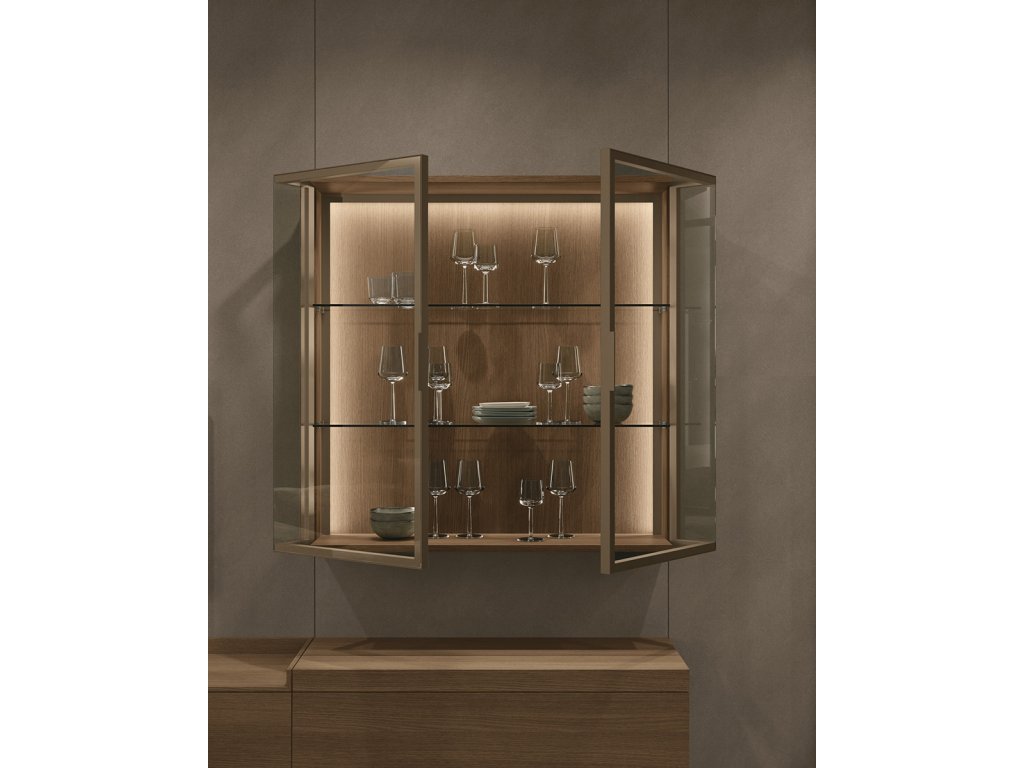 - Teka Aura – vitríny so zadným panelom v dekore rovere cognac, sklenené dvierka a boky, kovová konštrukcia Palladio, integrované osvetlenie.