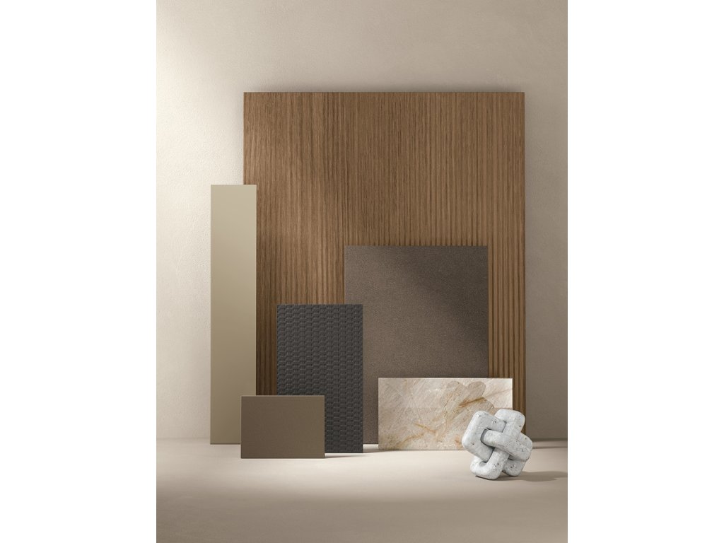 - Laminátové drevo dekory: Materico rovere cognac (dub cognac), materico calce scura (tmavý vápenec), materico opaco arena (matná aréna).