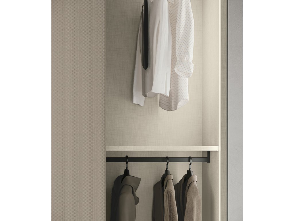 - Strip – šatníková skriňa s matným povrchom arena, vloženým pásom Piquet, interiér v dekore „tela“ (textilný efekt).