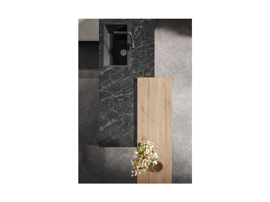 Pracovná doska z PIETRA NERA/čierneho kameňa dodáva kuchyni luxusný charakter, zatiaľ čo pult z ROVERE SCANDINAVO/škandinávskeho dubu prináša teplo a útulnosť.