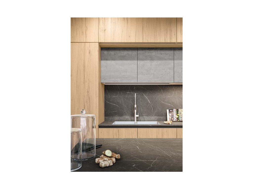Impozantný portál, ktorý zahŕňa vysoké, základné a nástenné jednotky v odtieni ROVERE ALASKA/aljašský dub, rámuje pracovnú plochu a vytvára upokojujúcu, štýlovú rovnováhu. Rôzne hĺbky nástenných jednotiek v osvetlenom OSSIDO GRIGIO/sivom oxidu dodávajú celku na dynamike a vizuálnej zaujímavosti.
