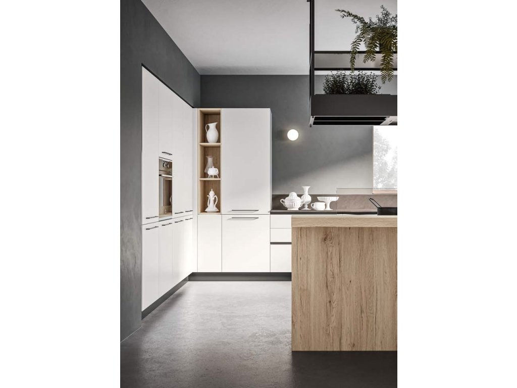 INFINITY 05 je kompozícia kuchyne, kde sa drevo harmonicky snúbi s bielou farbou. Jej sivé základné jednotky obopínajú predné časti dvierok, ktoré sú v prevedení BIANCO DIAMANTE/diamantovo bielej farbe, pričom zahŕňajú aj nástenné jednotky a mini zásteny vo farbe FOKOS TERRA/spálená zem, doplnených o zodpovedajúcu pracovnú dosku. Vrchná časť snack baru zo ROVERE SCANDINAVO/škandinávskeho dubu sa elegantne odráža v štýle severského ROVERE NORDICO/nórskeho dubu a spolu s otvorenými policami dodávajú kuchyni vzdušnosť a praktickosť.