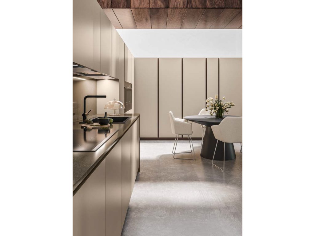 Tento model sa pýši elegantným a sofistikovaným dizajnom. Jemné tóny béžového laku sú doplnené o sokle v odtieni MARRONE TERRA/hnedá zem a zapustené úchytky, ktoré pridávajú na celkovom estetickom dojme. Kremenná pracovná doska MAPLE BROWN/javorovo hnedá vkusne zvýrazňuje čiernu farbu indukčnej varnej dosky, drezu a vodovodných batérií, zatiaľ čo tlmí ostrý kontrast s bledými čelami skriniek.