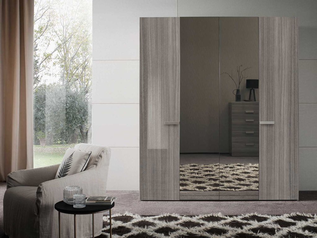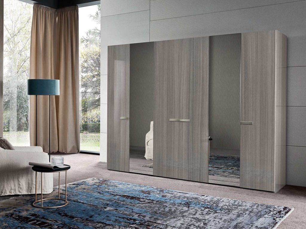 - Šatníková skriňa s drevenými dverami a s dvomi zrkadlami: