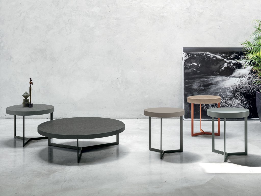 Stolík JOY PLUS je v troch veľkostiach. Hrubá doska stolíka s možnosťou rôznych štruktúr a farebného prevedenia leží na kovovej konštrukcii s tromi nohami, ktoré sa stretávajú v strede obvodu.